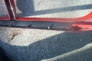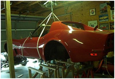 Attaching the lift straps - The straps have hooks that must catch the rocker channels just in front of the doors and at the rear of the doors. Make sure the rocker channels are not too rusty to hold up the weight. Support the nose with a second come-a-long attached to the bumper beam.