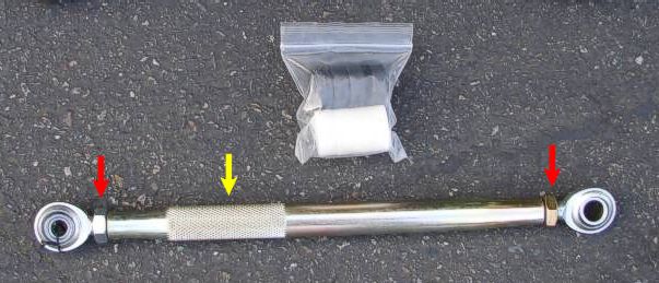 The struts are very easy to adjust. Just use a level on the wheels and turn the two outer nuts on the strut bar (red arrow) and twist the knurled part of bar (yellow arrow) until you get the wheel/tire perpendicular.
